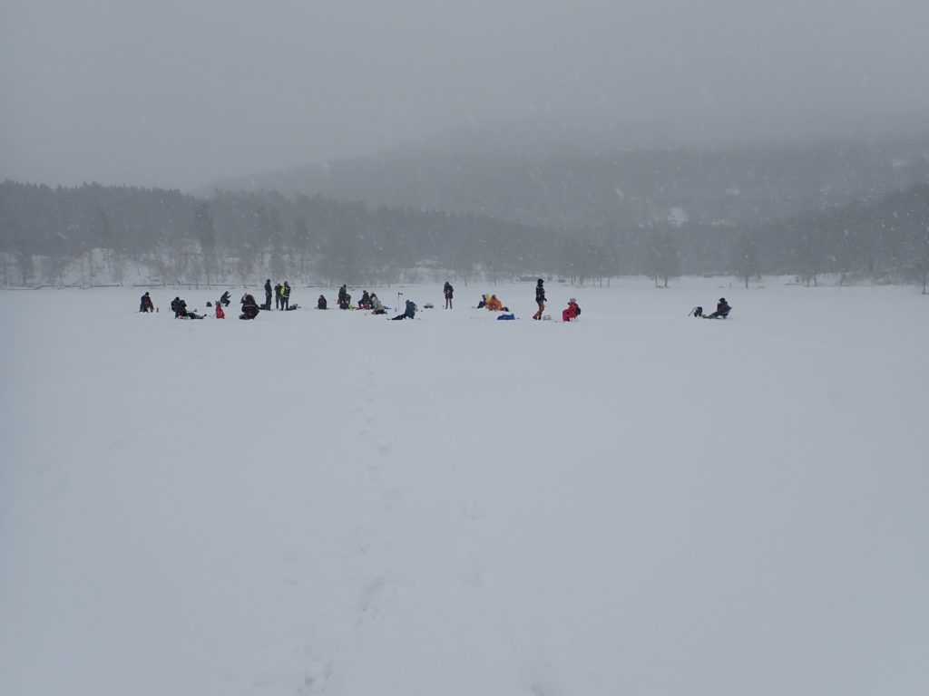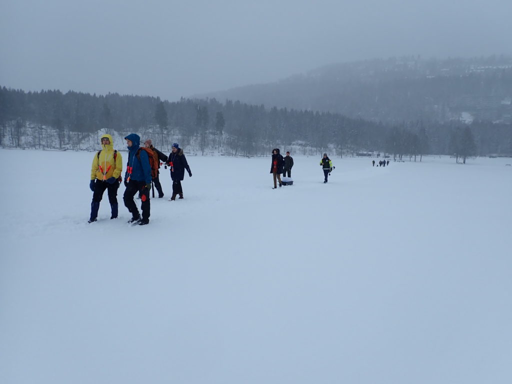 Deretter trasket vi i rekke utover isen for å finne fisken! Ca 20 cm. is på hele området, så trygg is – men ispigger er obligatorisk utstyr. Mange hadde med seg utstyr, og de som ikke hadde, fikk låne av oss.
